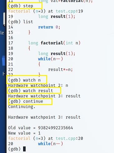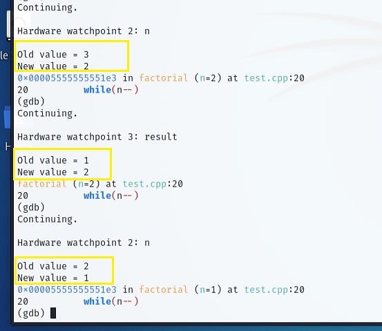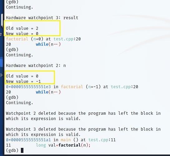 When "n" values shift to -1, the loop may not execute anymore. Next, call the function. Notice when a variable is out of scope, watchpoint deletes it.