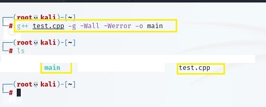 GCC is a Linux compiler that comes pre-installed in Linux. Use the "g++" command to convert the source code "test.cpp" into an executable "main." Use "-g flag" so you can debug the code later as well.