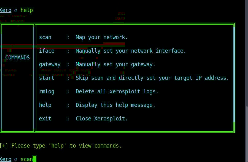 As shown on the image above, we are on the “home page” of xerosploit tool. You can use command ‘help’ to check the commands list and their functions as shown on the image below