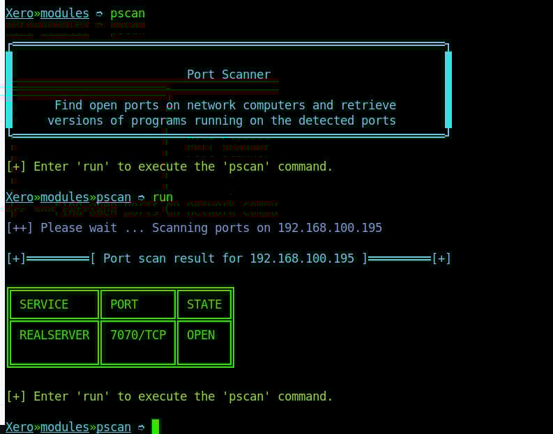 After selecting the target device, our first attack is to scan the open ports on our target system. To scan this, we will use the pscan module using command βpscanβ. This command will check for open ports on our target device as shown on the image below.