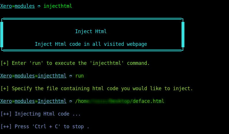 This kind of attack is similar to the βinject Jsβ attack on xerosploit. However, in this attack, the attacker aims at adding HTML content to the webpage on an insecure website. To launch this attack we select to use the inject HTML module and specify the path to our HTML file on the computer as shown on the image below.