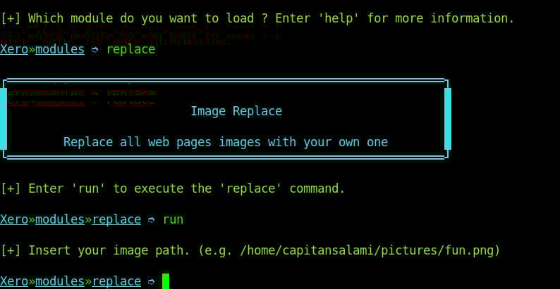 The replace module replaces all the images found on the page of an insecure website which is being visited by the target device. To run this attack, we will use command replace on the modules menu. Xerosploit tool just needs us to specify the location of the image file that we want to replace with as shown on the image below.